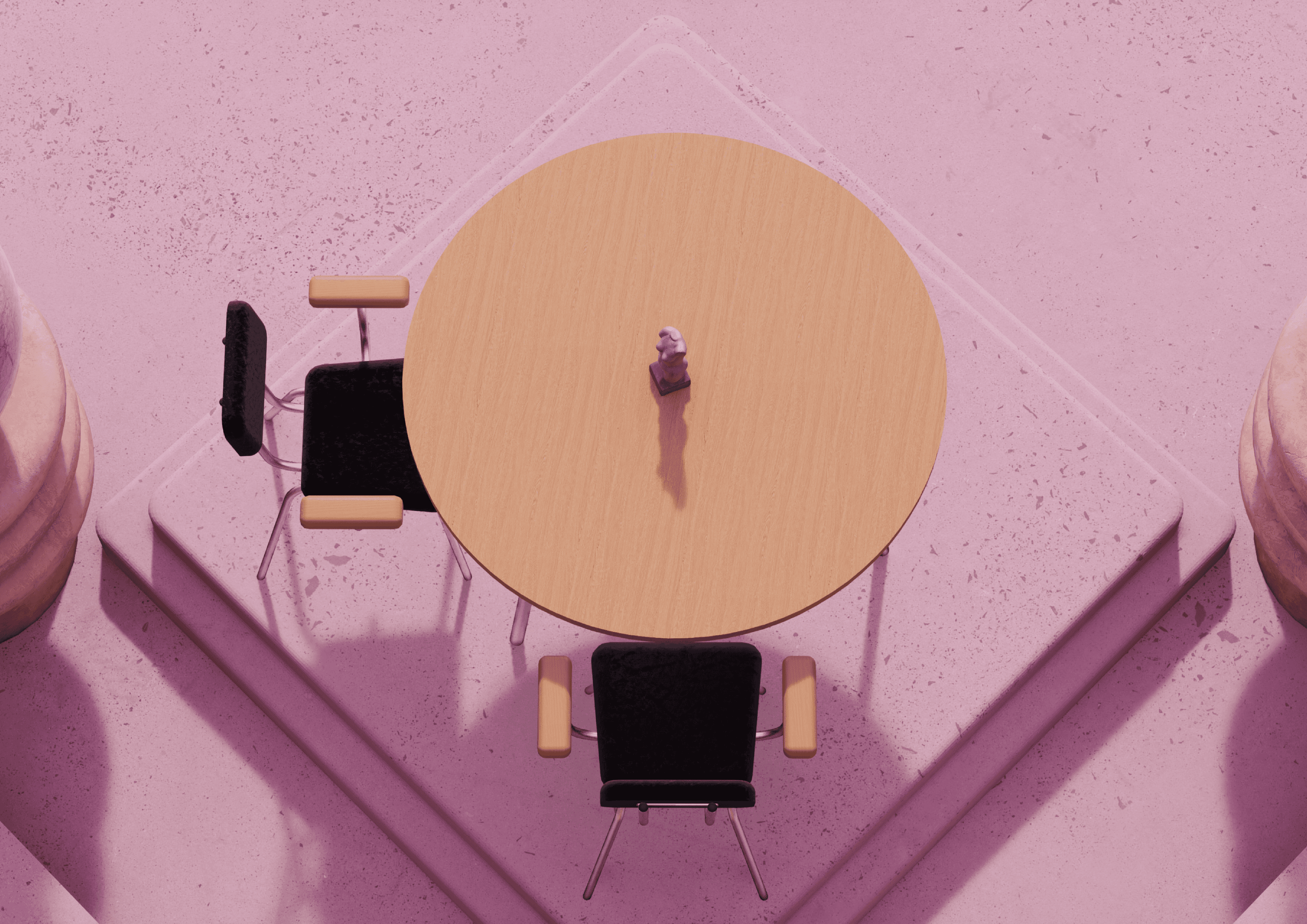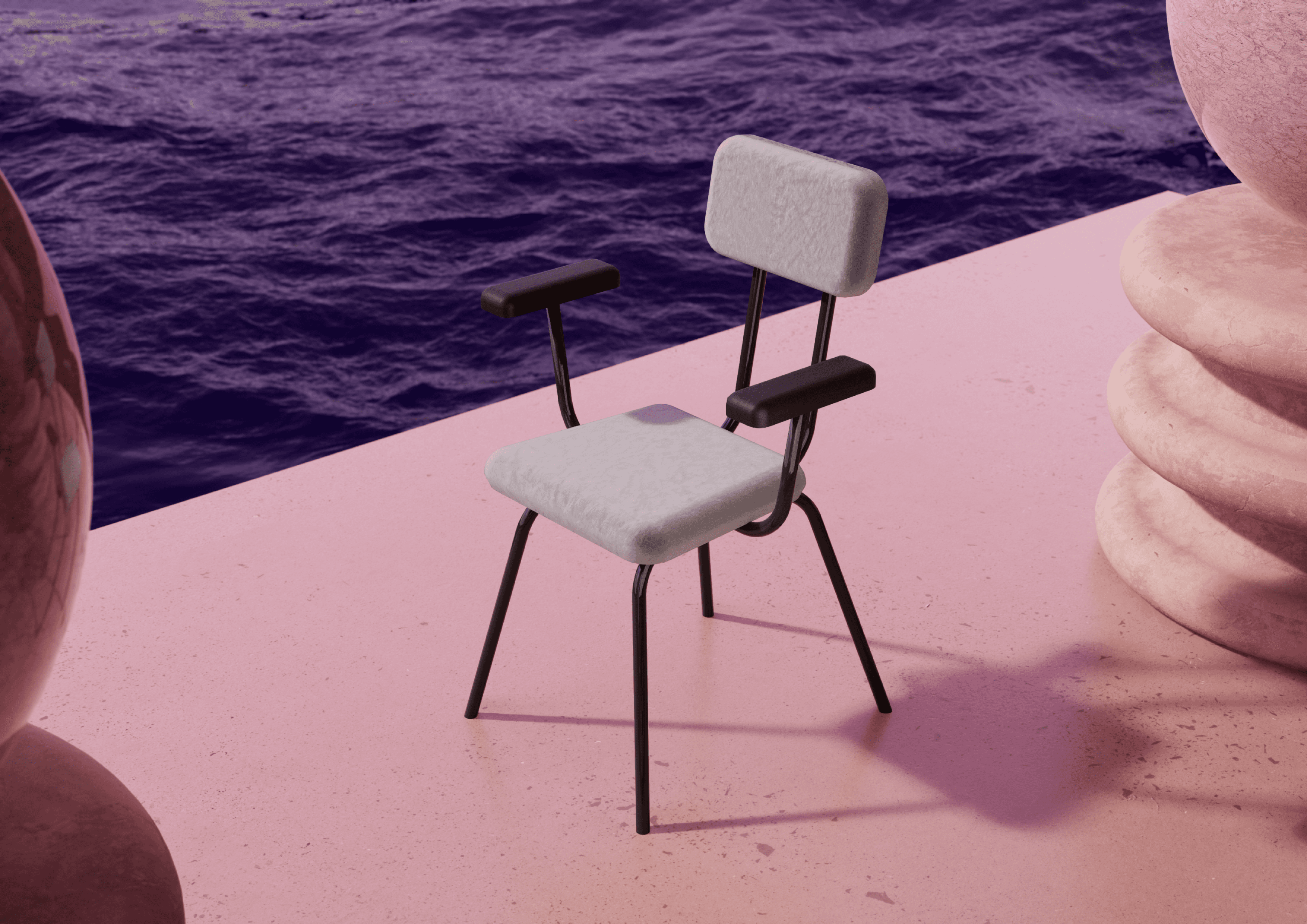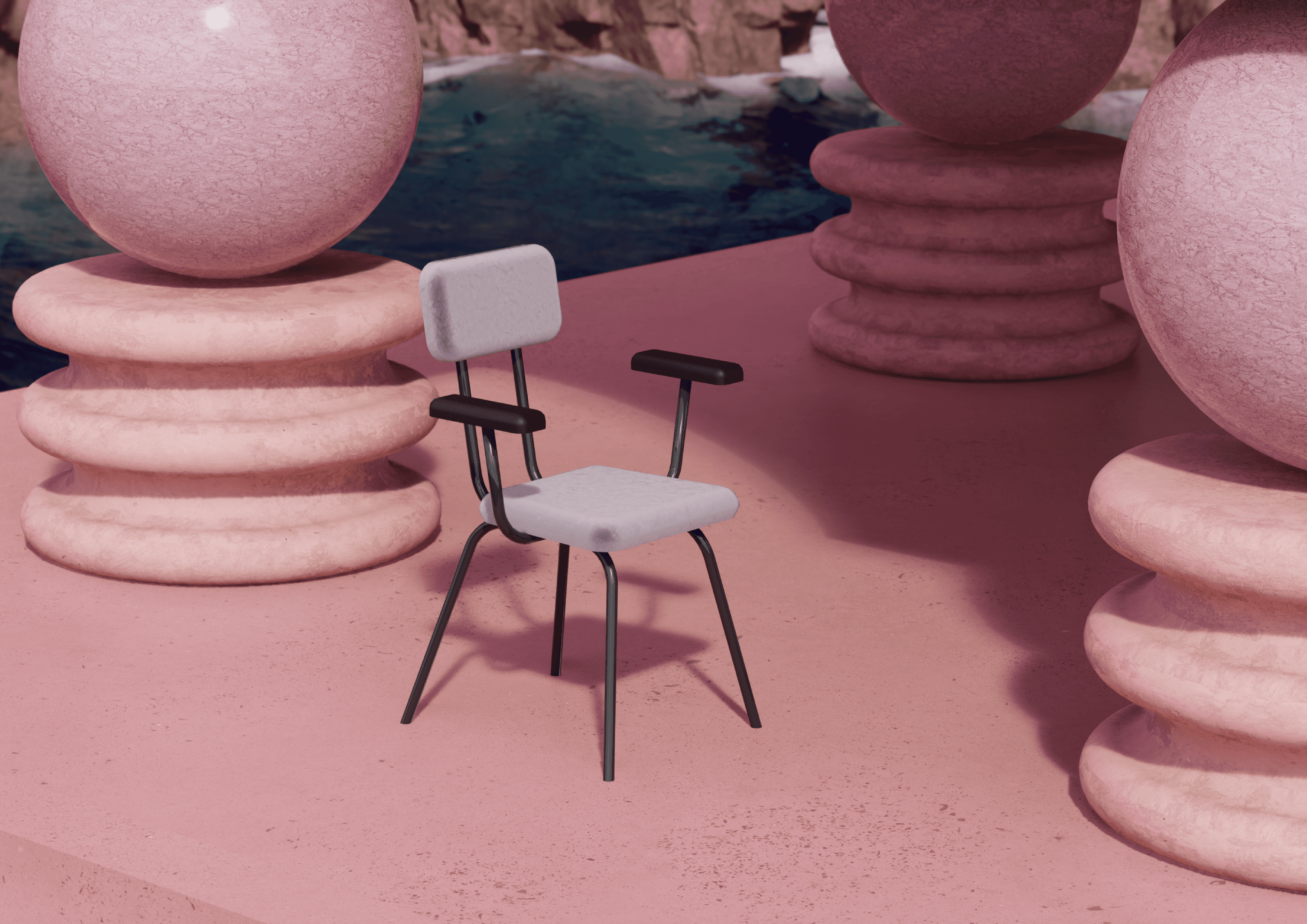 We designed and built a surreal gallery set in the middle of the ocean, surrounded by abstract landscapes and reflective, pink-toned materials. The contrast between the environment and the furniture allowed each piece to become the focal point, emphasizing form, proportions, and materiality.